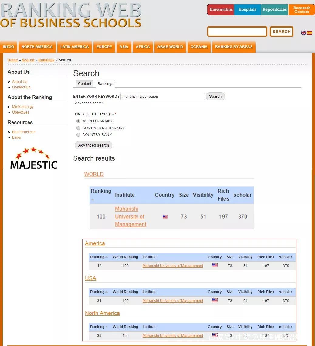 美国玛赫西管理大学商学院获得韦伯麦特里克斯网 (Ranking Web of Universities)