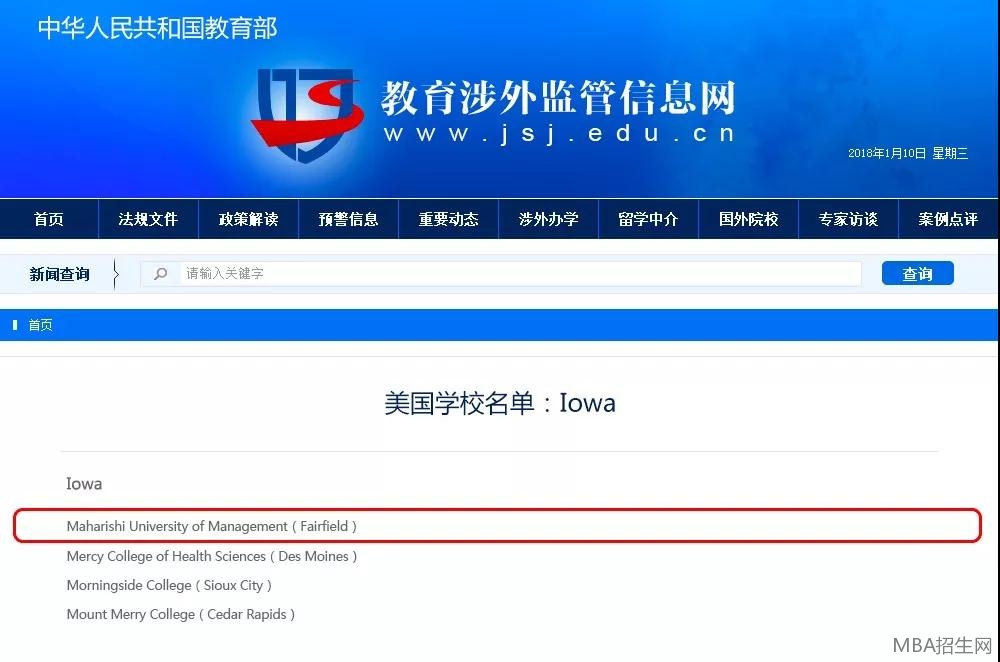 美国玛赫西管理大学(MUM)获得了美国高等教育委员会(CHEA)、美国教育部(ED)、美国大学商业教育认证(IACBE)、美国六大联盟认证(HLC)、美国北中协会(NCA)、中国教育部涉外监管网以及其他高等教育相关机构等认证。