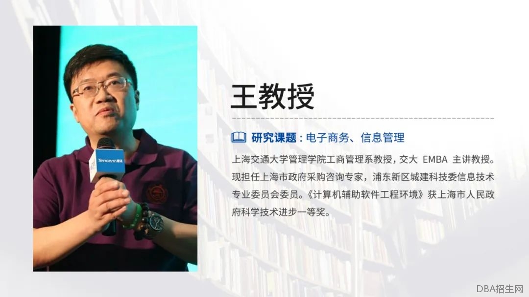 王博士,上海交通大学管理学院副教授,上海交大管理学院EMBA主讲教授。国内电子商务与信息化管理的技术型与管理型双重专家。上海交通大学管理学院EMBA学员最受欢迎讲师之一,现担任上海市政府采购咨询专家,徐汇区人民政府专家顾问委员会委员,浦东新区城建科技委信息技术专业委员会委员。善于将复杂枯燥的信息技术与信息管理内容深入浅出,讲课风趣,注重应用,著有《电子商务-管理新视角》。教授成就: